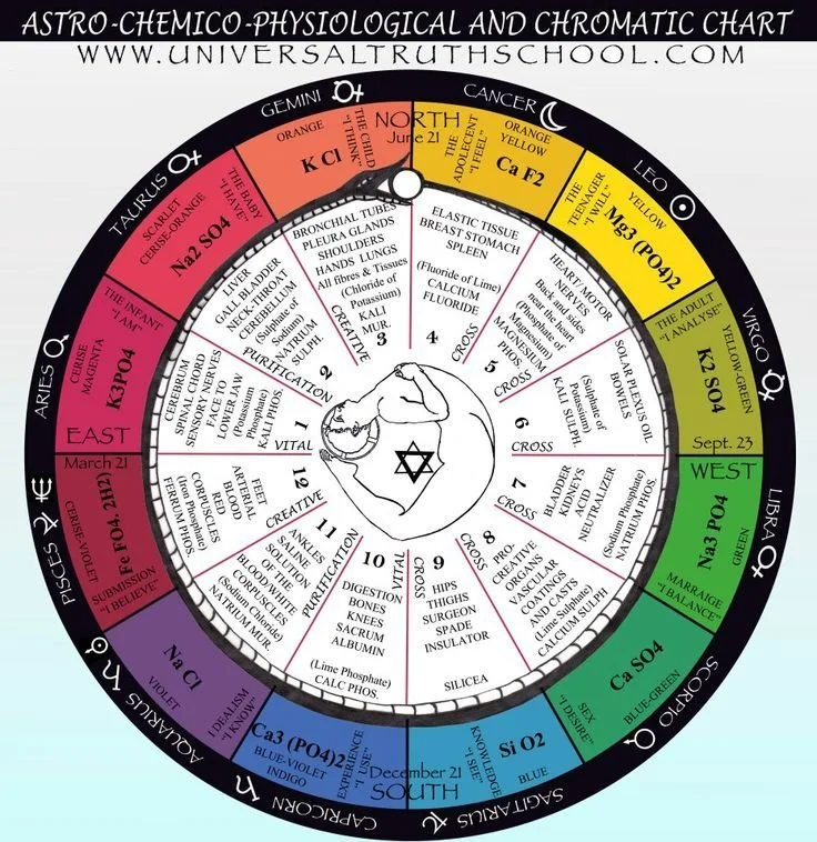 The noble science of astrology has and amazing system of health & balance based on the angles of light or placement of the planets in the birth chart. Each part of the body is connected to a specific element and there is a mineral associated with that part. There is a system of homeopathic cell/tissue mineral salts that can support the sessions.